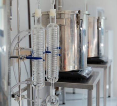 地元の湧き水を熱した水蒸気で蒸留。蒸気で芳香成分を気化させ、冷却水で冷やすと、精油と蒸留水が分離した状態で抽出できます。