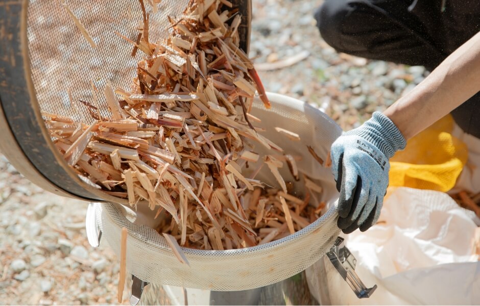 素材を目視で確認し、汚れを取り除きます。その後、心材(枝の中心部)は薪割りをして細かく粉砕します。力仕事もすべて人の手で。